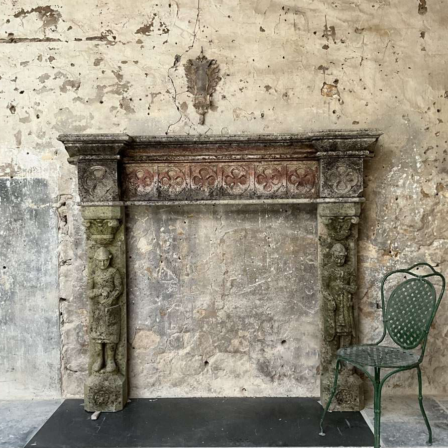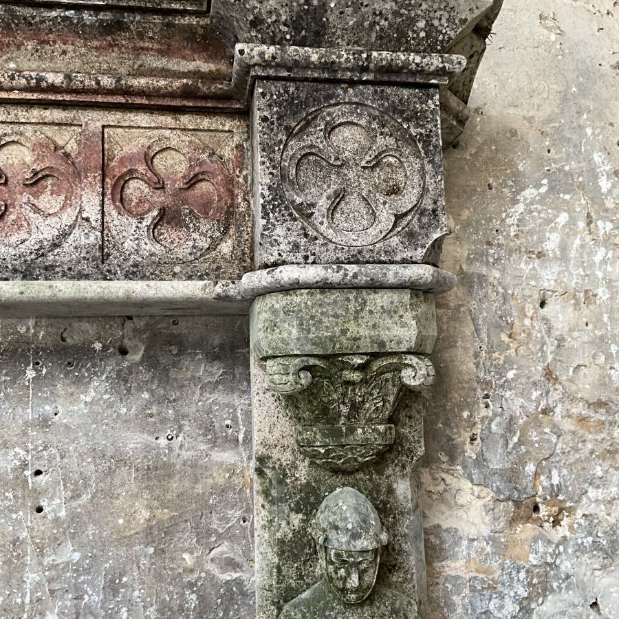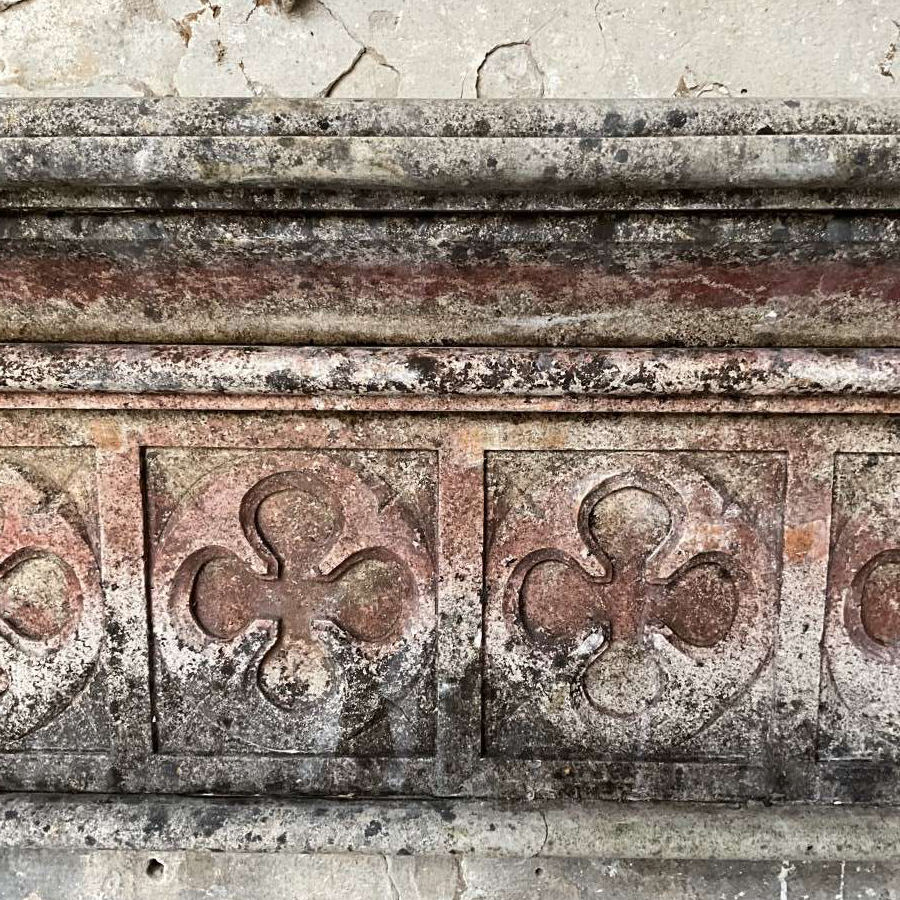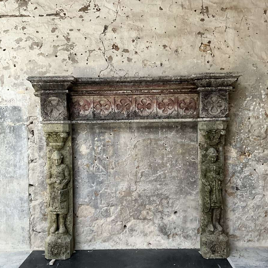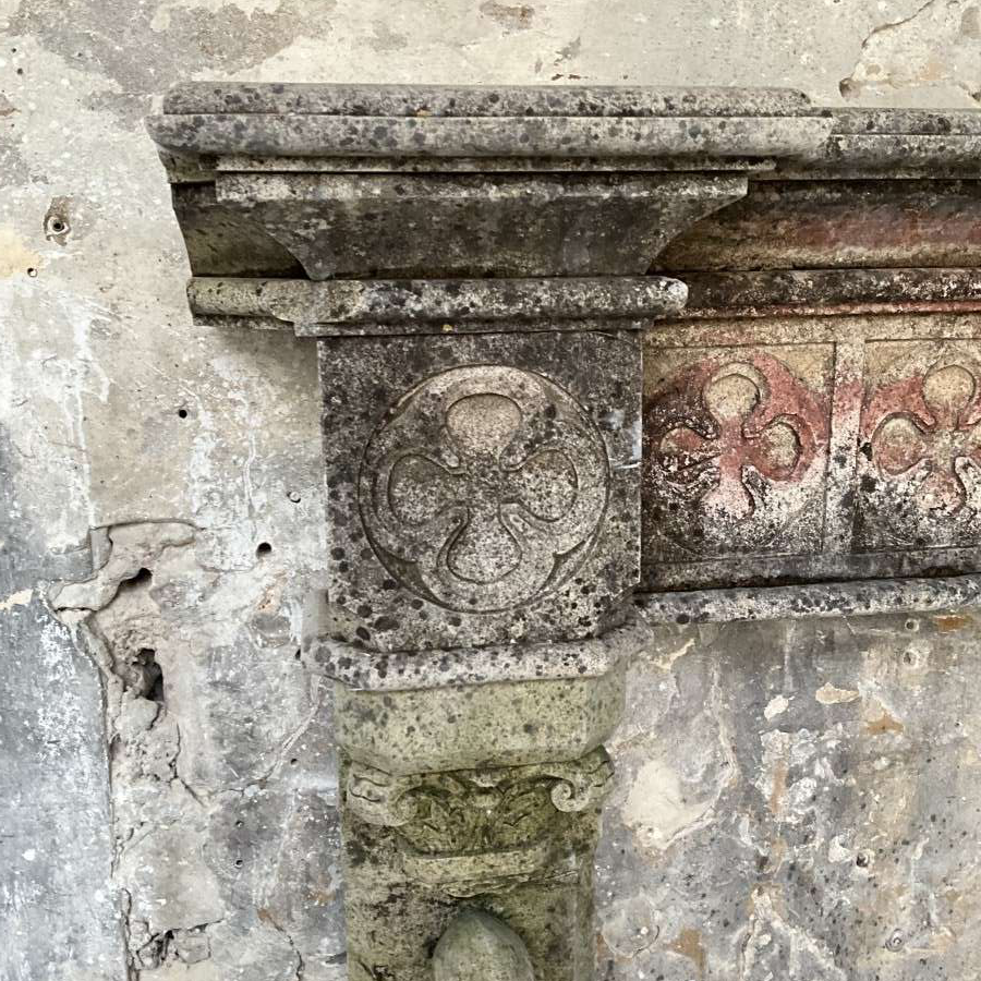 A large reclaimed carved stone Gothic Revival fire surround overall size 176cm wide x 155cm tall. Opening 112cm wide x 115cm tall. Depth of shelf 33cm. Sound structural condition with amazing patina. Please call 07974579694 for more info. Delivery can be arranged at cost.