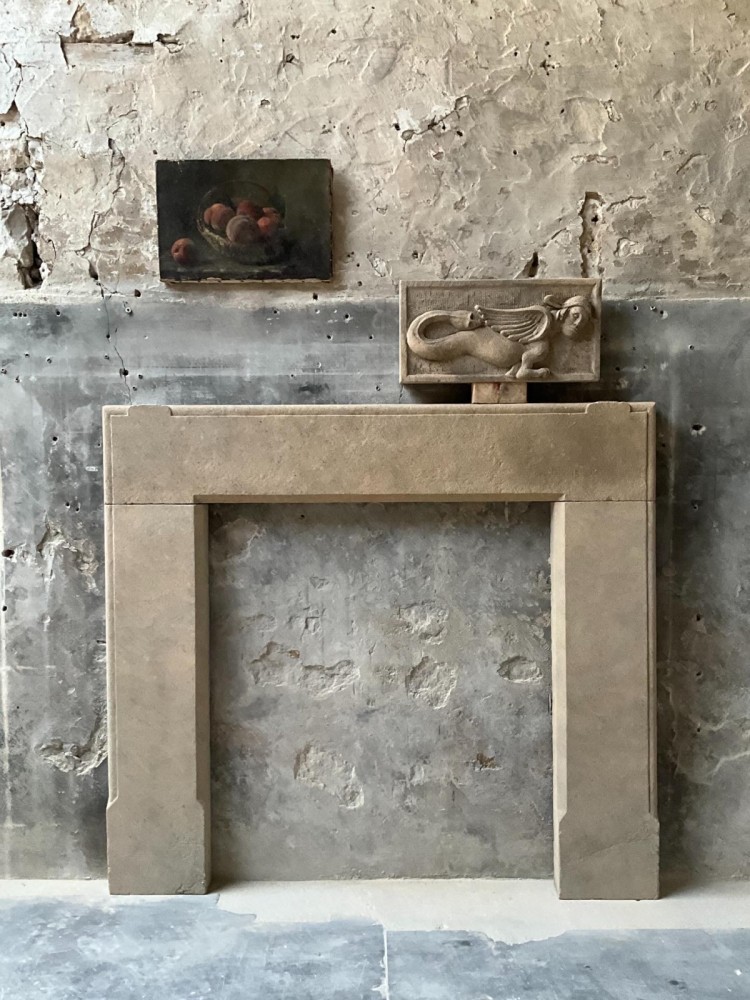 A 19th Century antique English stone fire surround with great wear. Overall width 126cm x overall height 115cm. Opening 82cm wide x 92cm tall. Depth 7cm. Installation and delivery available at cost.