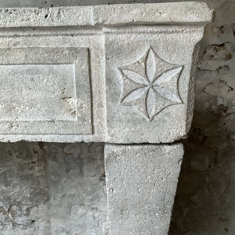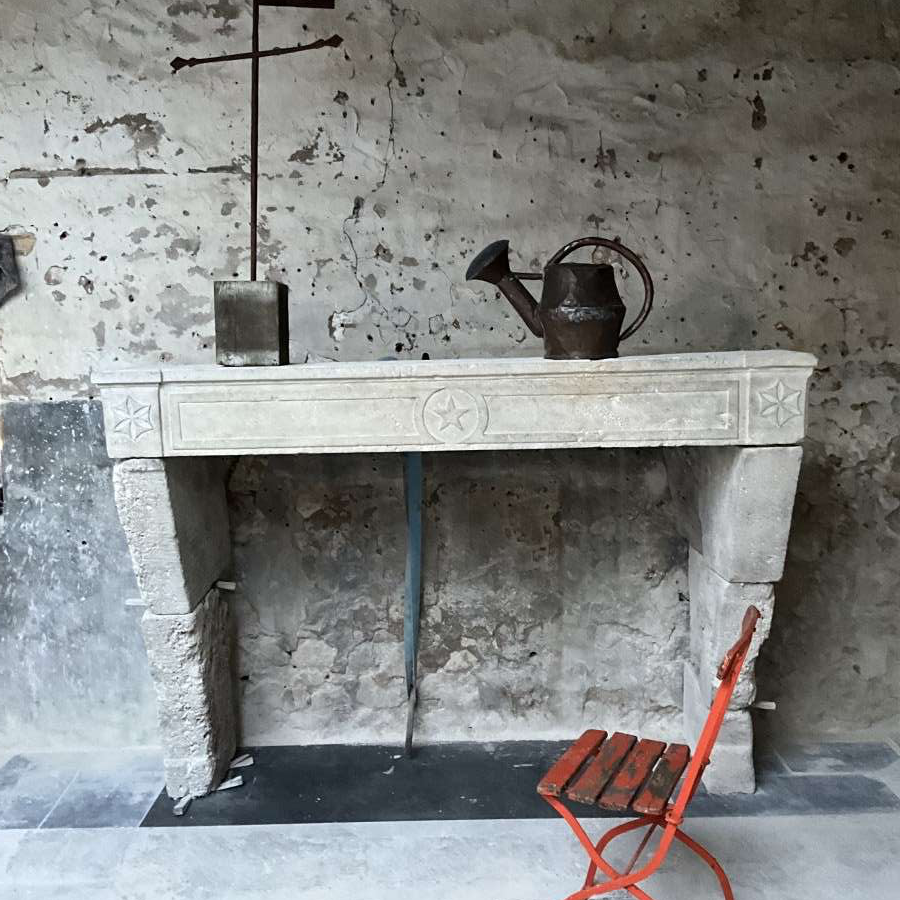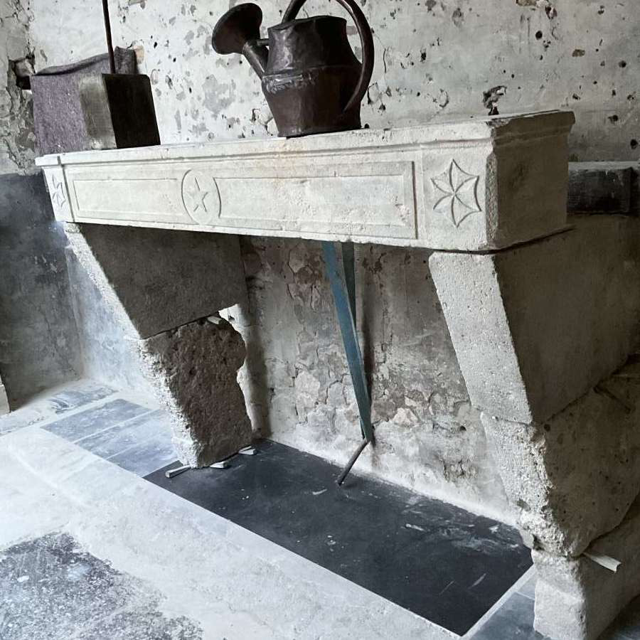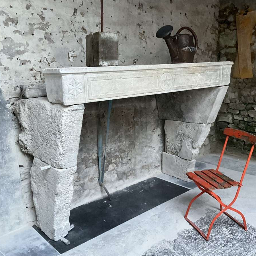 A large scale 18th Century limestone fireplace from the Bordeaux region. Overall width 200cm x overall height 150cm, opening 163cm wide x 123cm tall. Depth of mantle 31cm, revealed depth 65cm, overall depth 94cm. This style of fireplace needs building in. Good overall condition for age with a restored mantle.