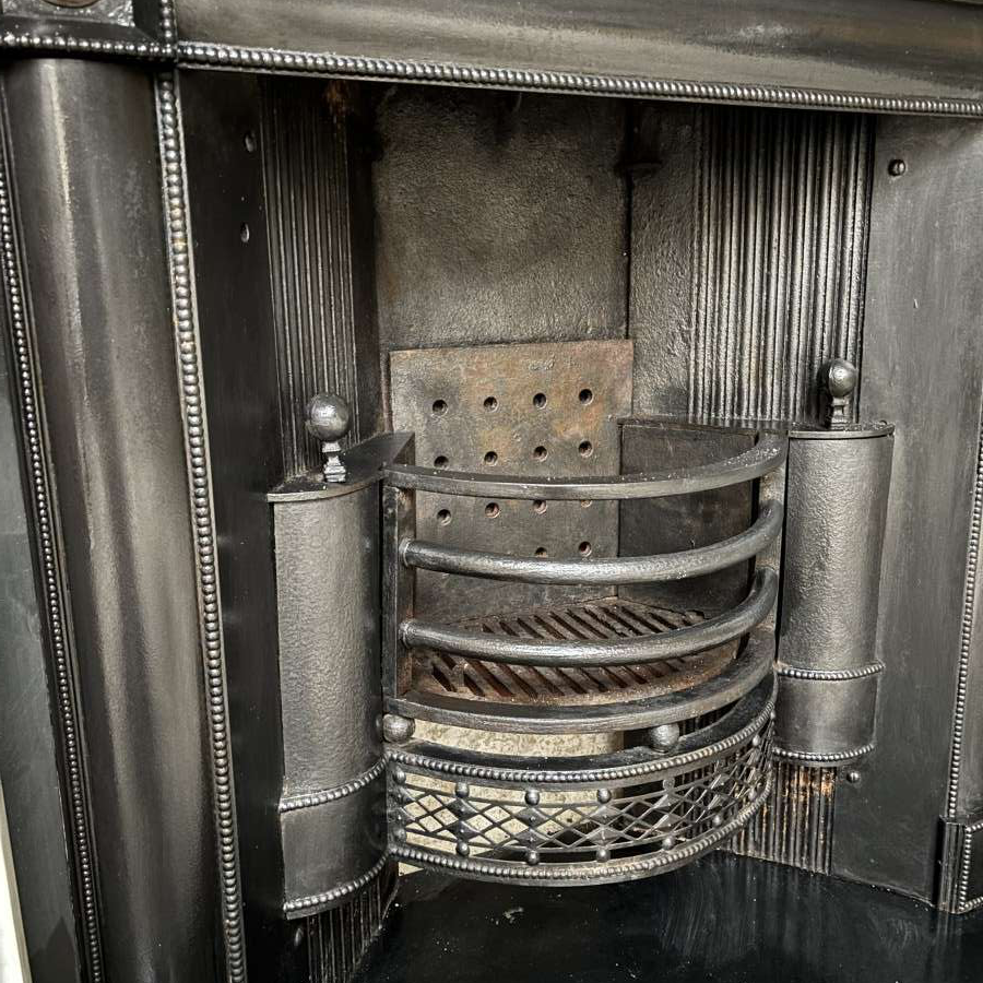 An elegant English Regency white Statuary Marble firesurround with its period cast register grate, all circa 1820. Overall sizes 157cm wide x 118cm tall. Very good original condition. National and export delivery arranged at cost.