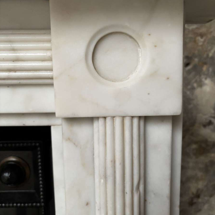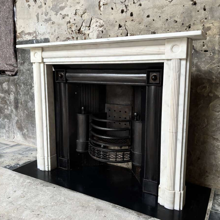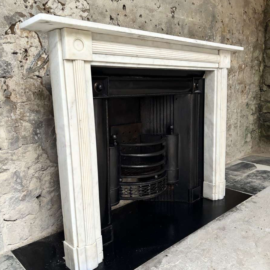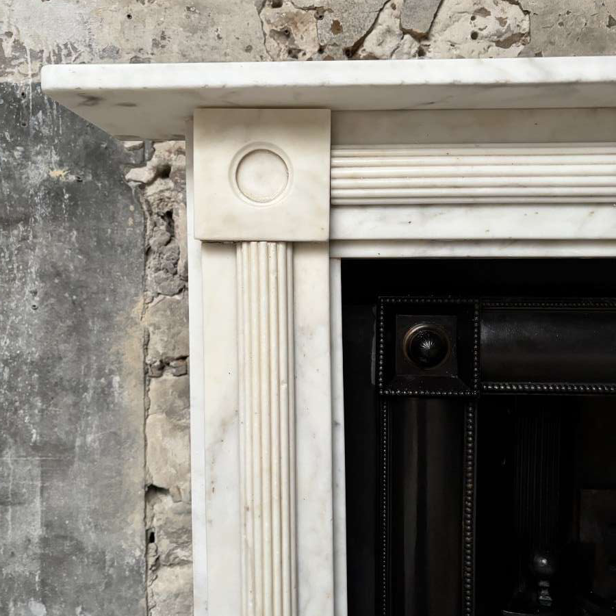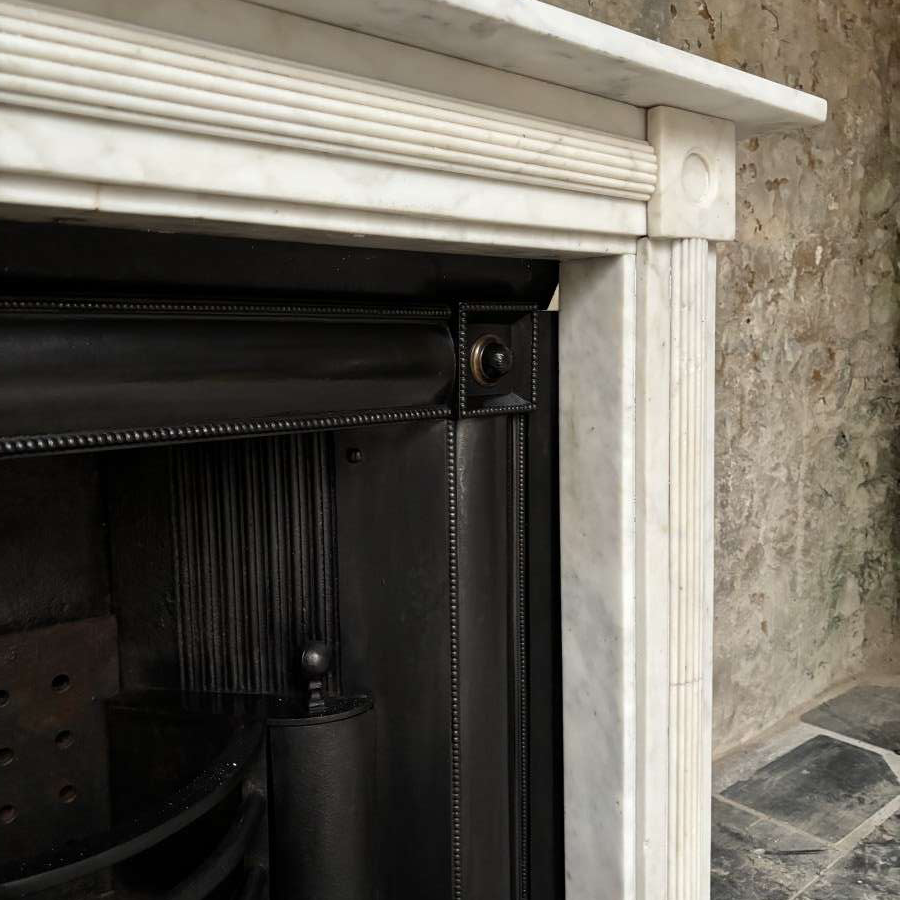 An elegant English Regency white Statuary Marble firesurround circa1820. (Please note that the black cast iron interior is not available). Overall sizes of marble firesurround 157cm wide x 118cm tall. Opening width 107cm x opening height 100cm. Depth of mantleshelf 21.5cm. Very good original condition, ready to install. National and export delivery arranged at cost.