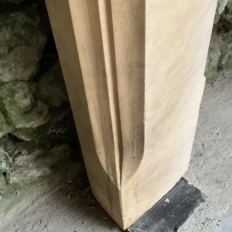 A reclaimed stone Gothic Revival fireplace, 20th Century. Overall width 165cm x overall height 124cm. Opening 102cm wide x 91cm tall. Depth of mantle 31cm. Old repairs and wear, can be cleaned up as required.